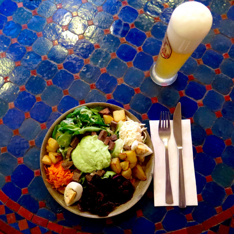 mit gekochtem Rote- Beete- Salat, Karottensalat, Selleriesalat, Blattsalaten, Ei, Bratkartoffeln, Rinderbrust und Avocadocreme