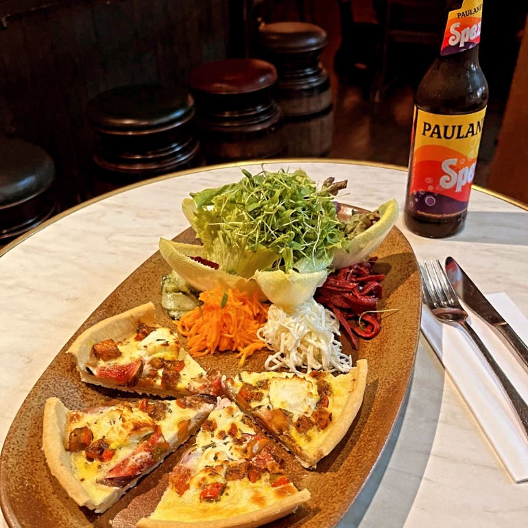mit Hokkaido- Kürbis, Ziegenfrischkäse und Feige, serviert mit schönem Salatteller