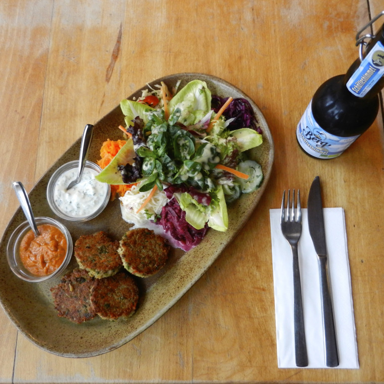 mit diversen Rohkostsalaten, Chicorée, Blattsalaten, scharfem Tomaten-Dip und Kräutersauce