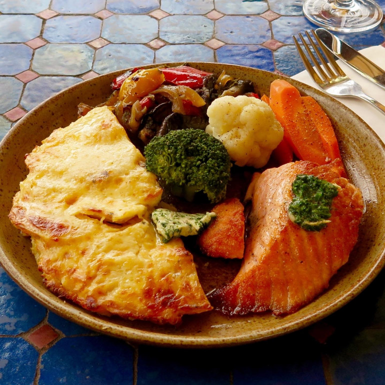 mit Kräuterbutter, Kartoffelgratin, Ratatouille und frischem Marktgemüse oder mit Kartoffelgratin und schönem Salatteller