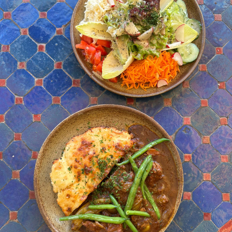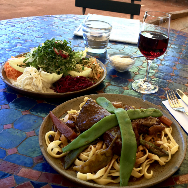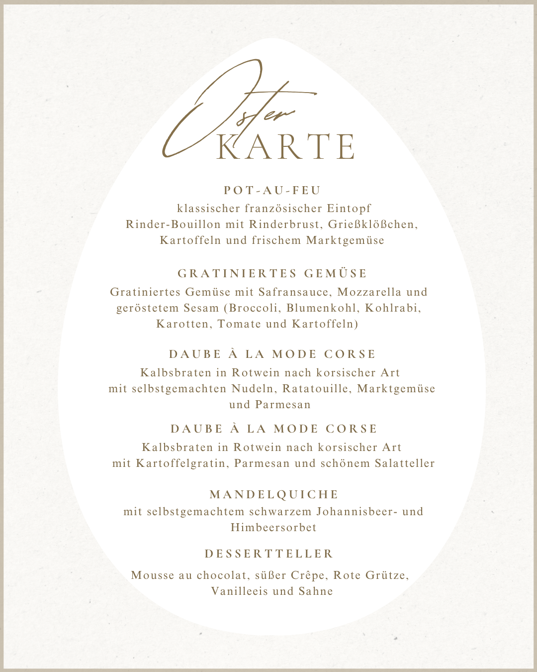 dazu zwei Beilagen nach Wahl: - Kartoffelgratin oder selbstgemachte Nudeln - Ratatouille mit Marktgemüse oder schöner Salatteller