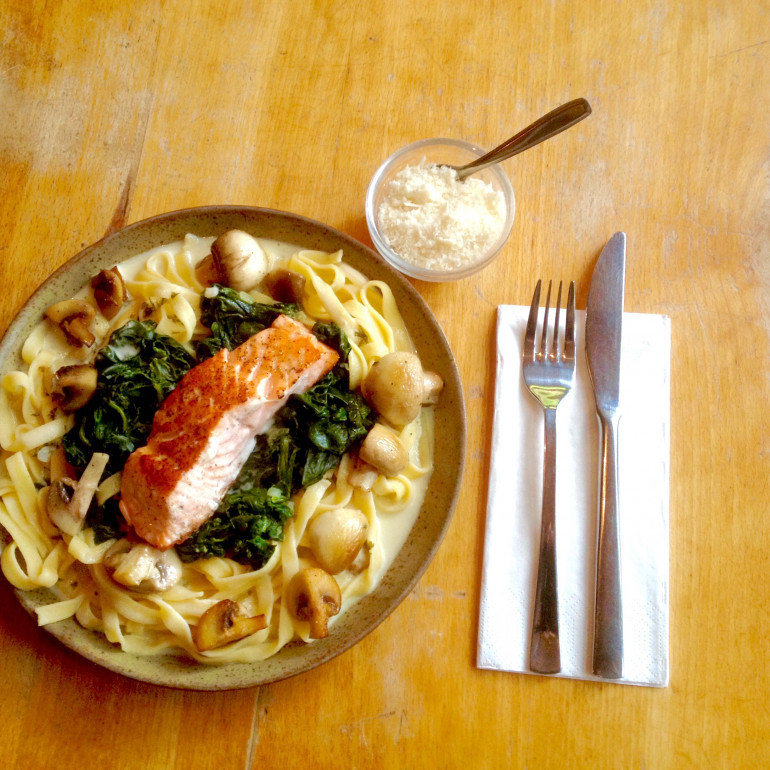 mit frischem Blattspinat, hausgemachten Nudeln, Champignons, Sahnesauce und Parmesan